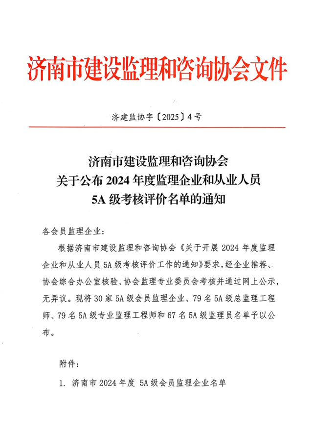近日,濟南市建設監(jiān)理和咨詢協(xié)會發(fā)布《關于公布 2024 年度監(jiān)理企業(yè)和從業(yè)人員 5A 級考核評價名單的通知》,我司憑借專業(yè)的技術實力、規(guī)范的管理水平與卓越的服務品質,成功獲評“濟南市 2024 年度 5A 級會員監(jiān)理企業(yè)”;同時,公司多名員工在個人評選中脫穎而出,榮獲“5A 級監(jiān)理從業(yè)人員”榮譽!